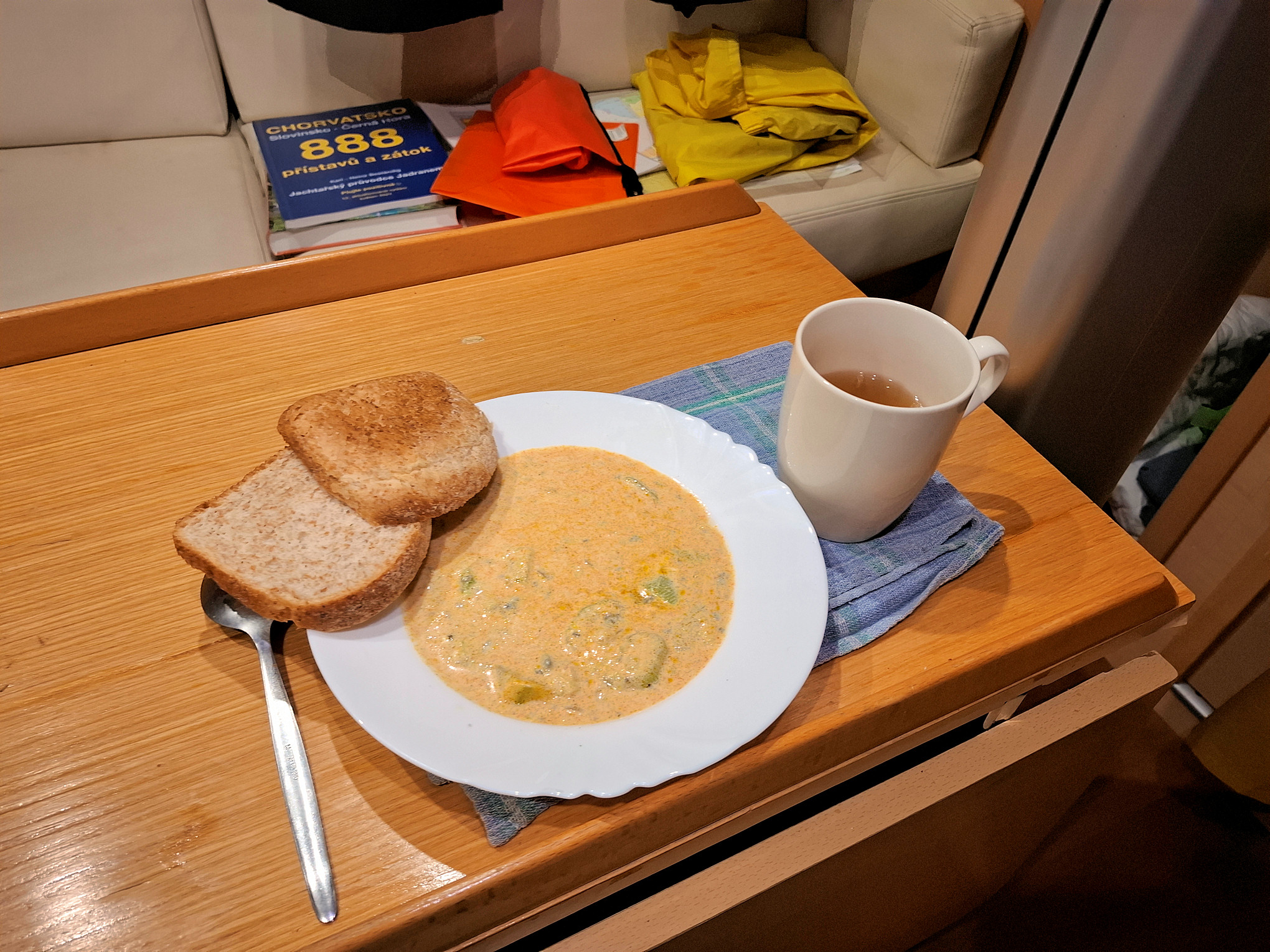 Around four o’clock I was back on the boat. I cooked the traditional zucchini on paprika with blue cheese and then I hit the hay.