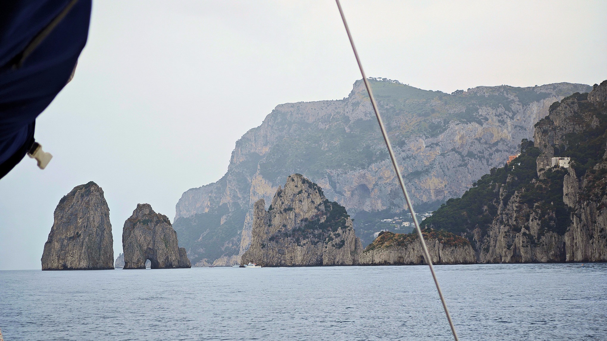 We left Salerno at five in the morning. We estimated five hours for the journey to Faraglioni di Caprio. These are rocks protruding from the water near the island of Capri, with an opening through which tourists are taken on motorboats.