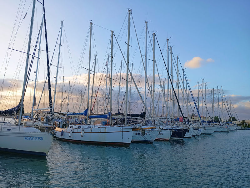 A large marina with lots of boats, and we found a spot too. We were protected from waves, but the wind was still blowing. Docking stern-to the pier was with one contact with the neighboring sailboat on the leeward side. But the sides of both boats were fine.