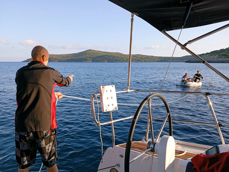 The bay is well-protected. We are in the lee, and the forecast says the wind will shift early in the morning, but it won't be strong. We put the stern anchor to avoid turning.