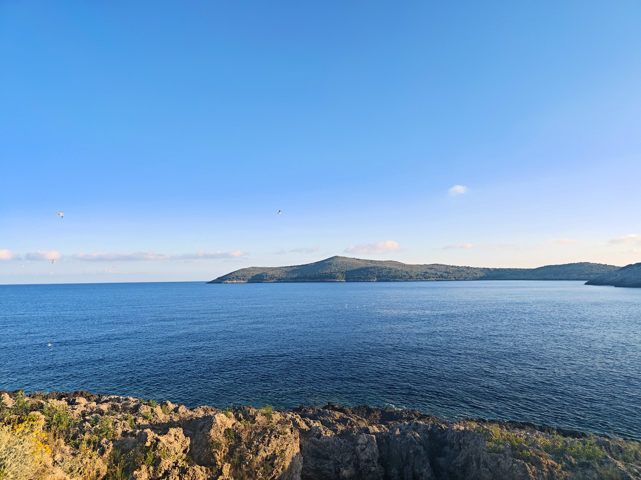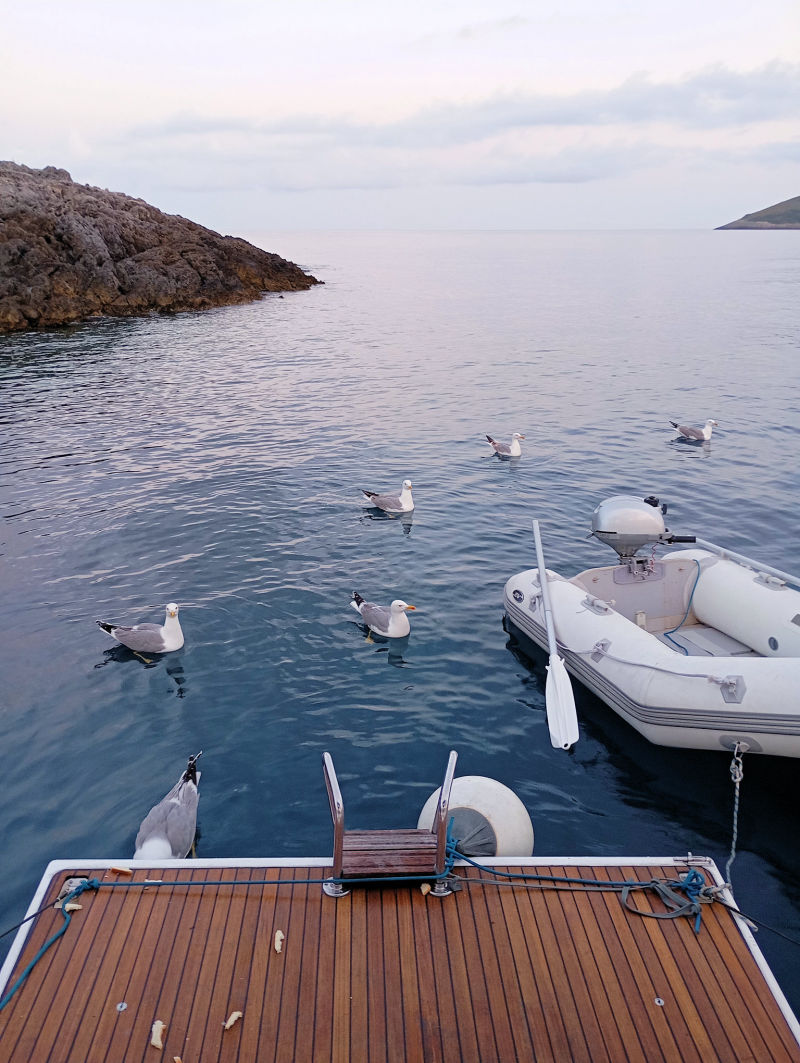 We chose the northern part and, in the company of a seagull colony, anchored around the corner of Cala Spalmatoi, this time with two anchors.