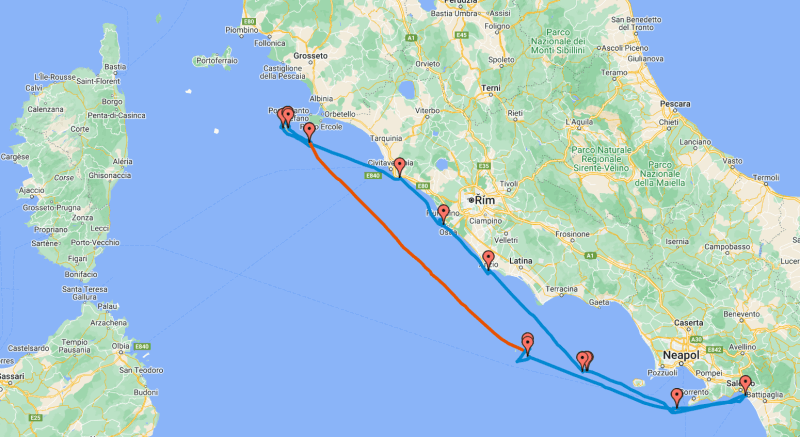 wind - 2-3 Bf on the first day in the morning, around four 4 Bf, dropping to 2-1 Bf in the evening and staying until Ponza