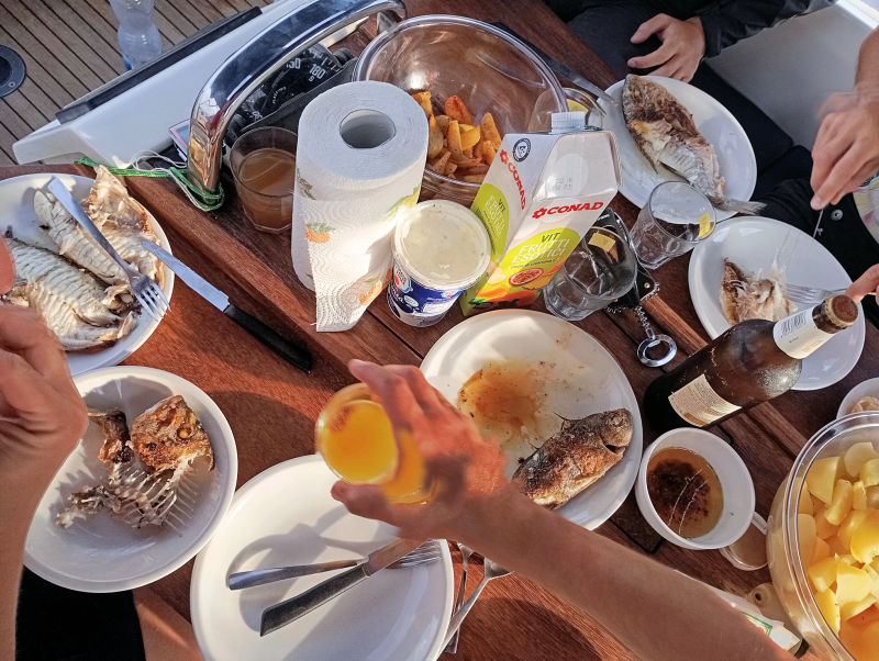 We arrived there after seven hours. We sailed two-thirds of the way with sails and the rest on idle speed. Before starting the engine on the southern side of the island, the skipper had to dive under the boat and untangle a line wrapped around the propeller.