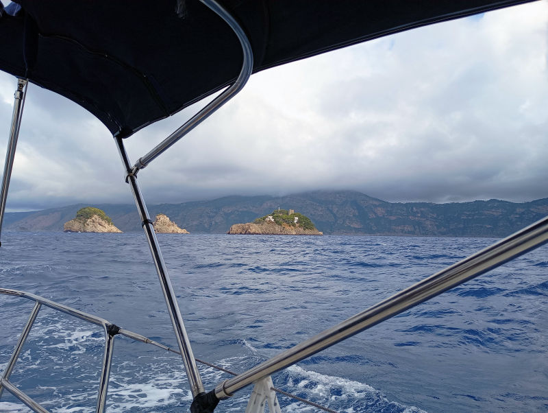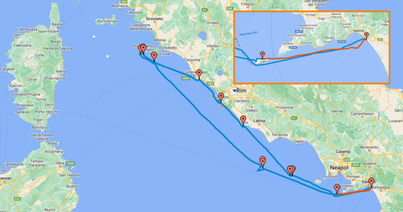 Even in the Bocca Piccola channel, we hoisted full sail and, with a gentle wind, sailed towards Salerno at a speed of 5 to 6 knots.