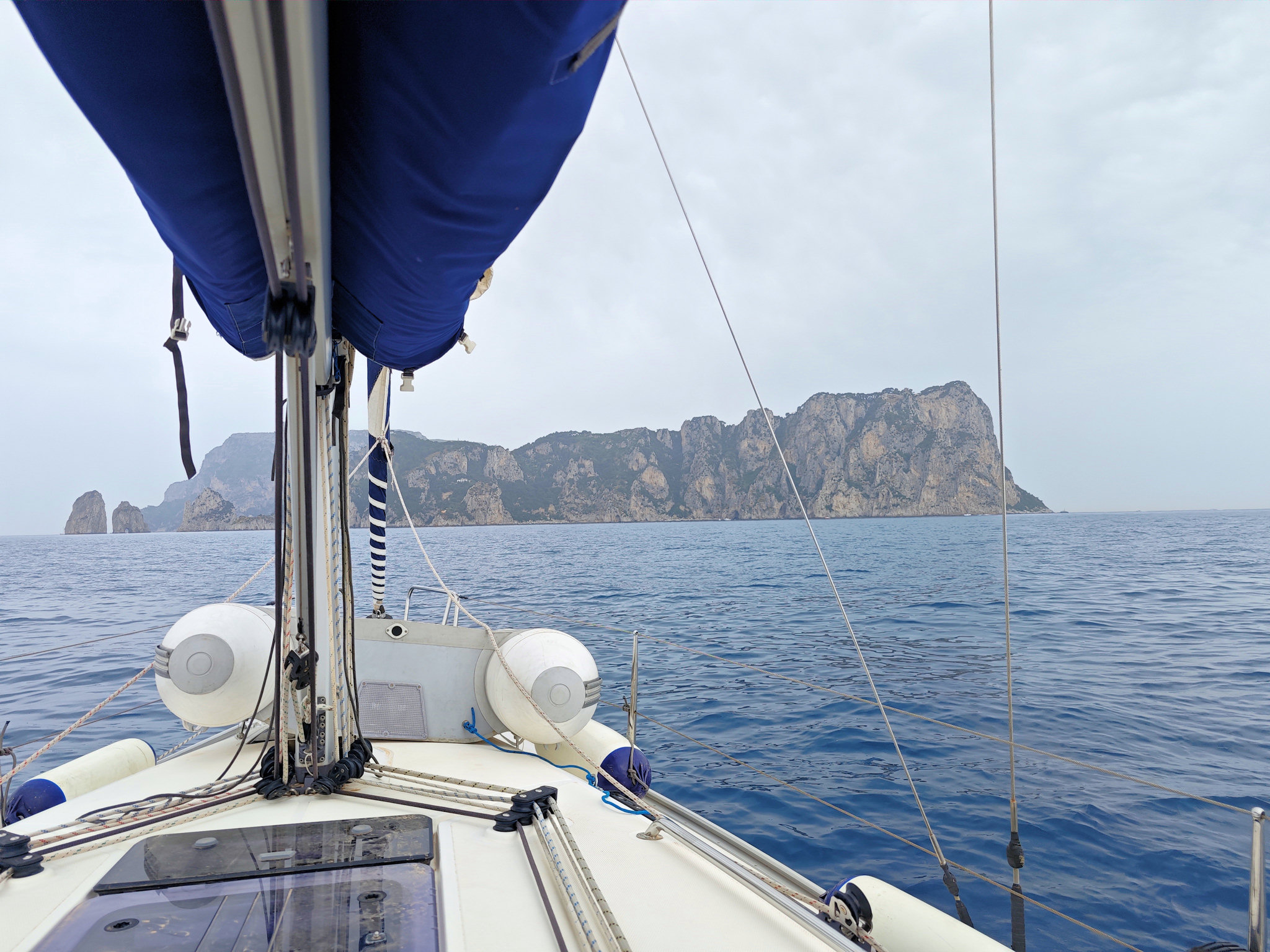 Ze Salerna jsme vypluli v pět hodin ráno. Počítali jsme pět hodin na cestu k Faraglioni di Caprio. Což jsou skály trčící z vody u ostrova Capri, které mají uprostřed otvor, kterým se turisté nechávají provézt na motorových lodích.