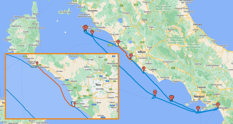 O půl dvanácté už máme plné prádlo a rychlostí kolem pěti uzlů na boční vítr míříme k městečku Santa Marinella.