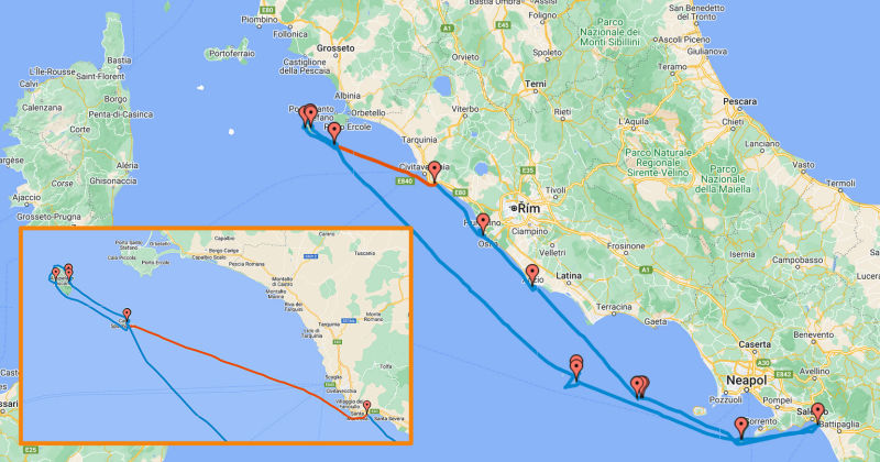 V deset vytahujeme kotvu a vyplouváme. Za hodinu míjíme Capo Linaro a měníme kurz na západo-severo-západ přímo k naší další destinaci ostrovu Giannutri. Stejně jako včera valíme na plné prádlo na boční vítr.