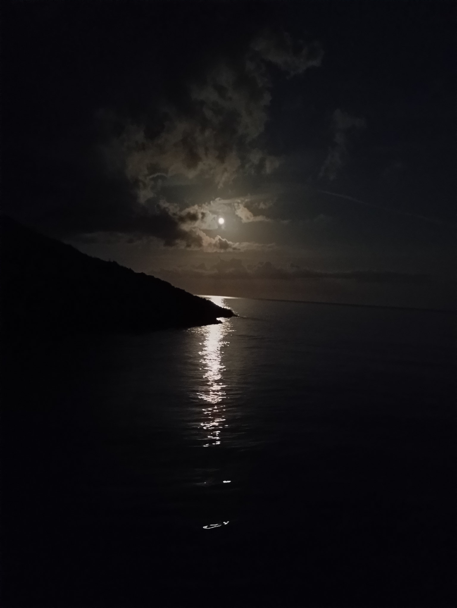 Zátoka je dobře chráněná. Jsme v závětří a předpověď říká, že se nad ránem vítr stočí, nicméně nebude silný. Kotvu na zádi dáváme, ať se neotočíme.