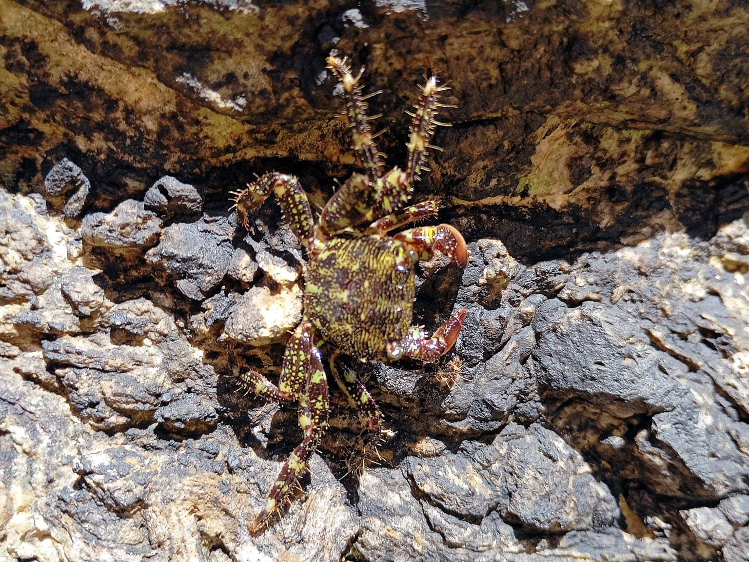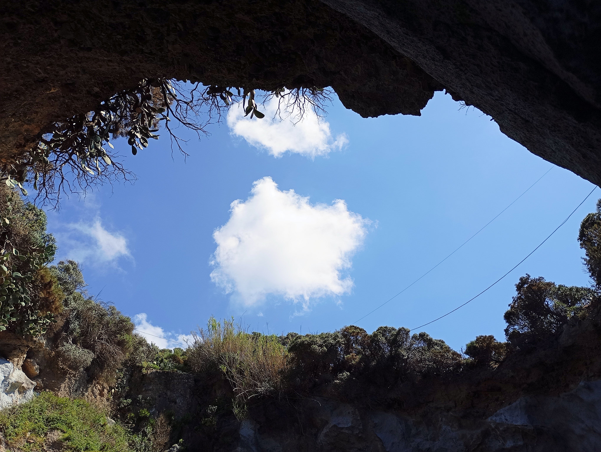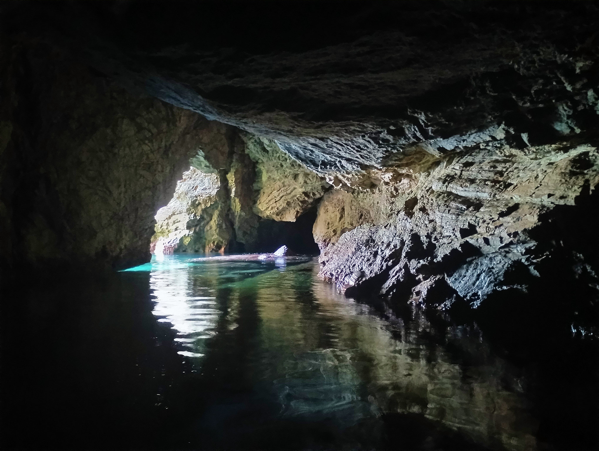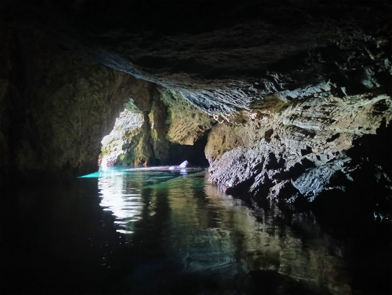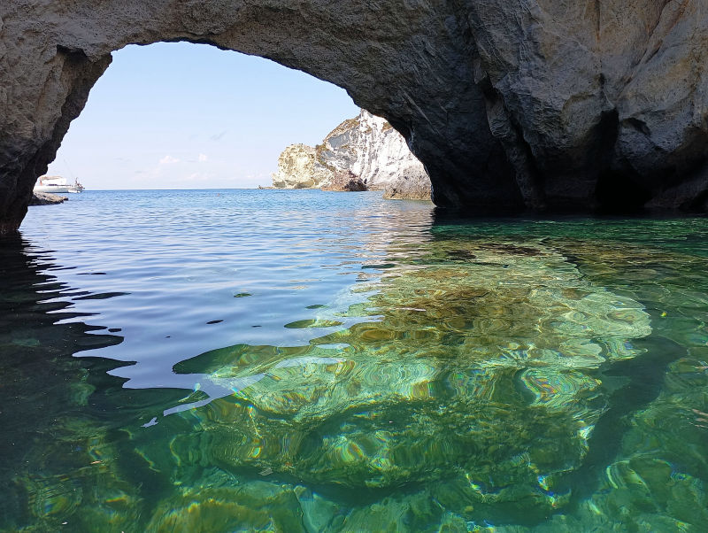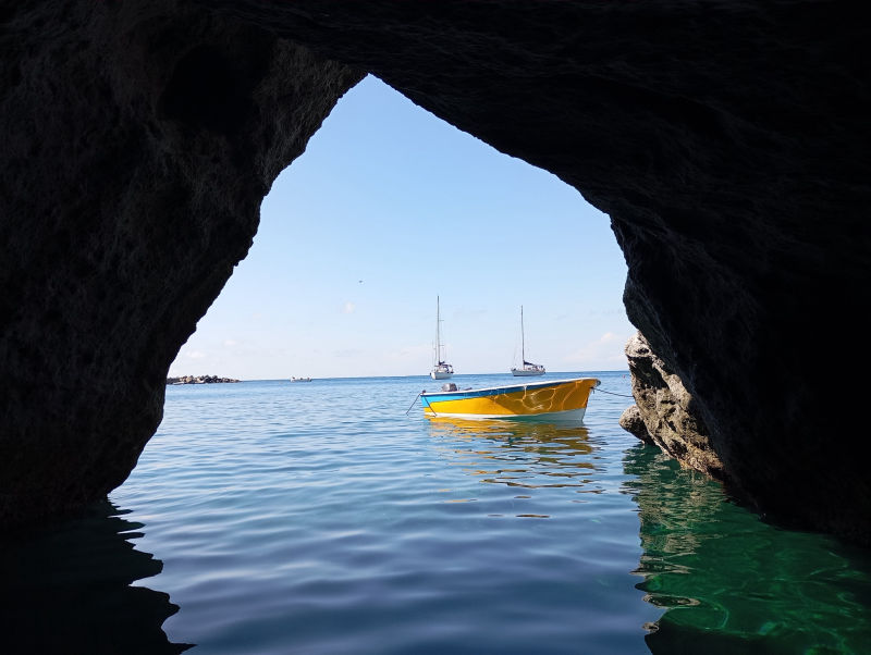 Cala di Feola je kouzelná zátoka. Necháme se zlákat dalšími dírami ve skále a na dinghyně jimi postupně propluje celá posádka :-)