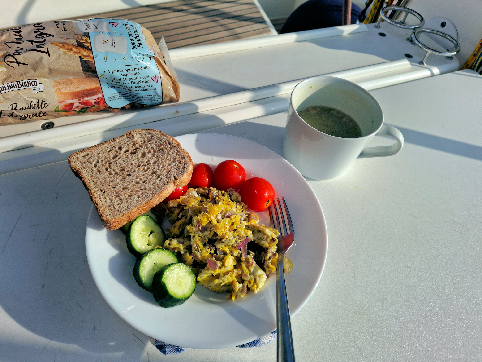 I had two visits from local fauna. First, a swarm of flies flew in from the shore to check me out. Or rather, to check out my food supplies.