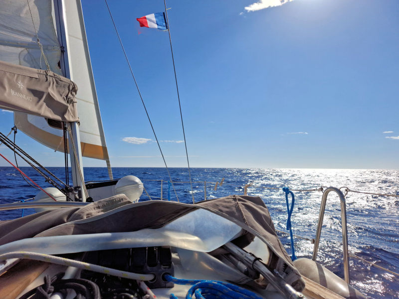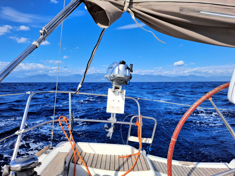 Sailing on a broad reach. Around noon I lowered the jib and took the steering wheel because the waves from the side were unpleasantly tilting the boat while sailing with autopilot.