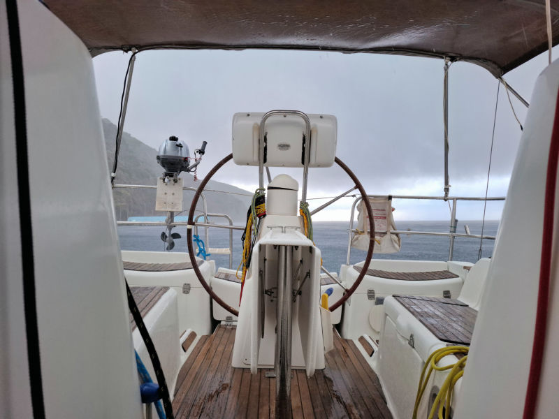 Po první sólo plavbě jsem si dal celodenní odpočinek přerušený jen trojím překotvením, zaklizením lan a úpravou výtahu hlavní plachty, resp. přivázáním pomocného lanka na výtah hlavní plachty a uvázáním druhého konce na lanko lazy jacku. Díky tomu přestalo lano výtahu při poryvech větru nebo zhoupnutí lodě bouchat do stěžně a byl klid :-)