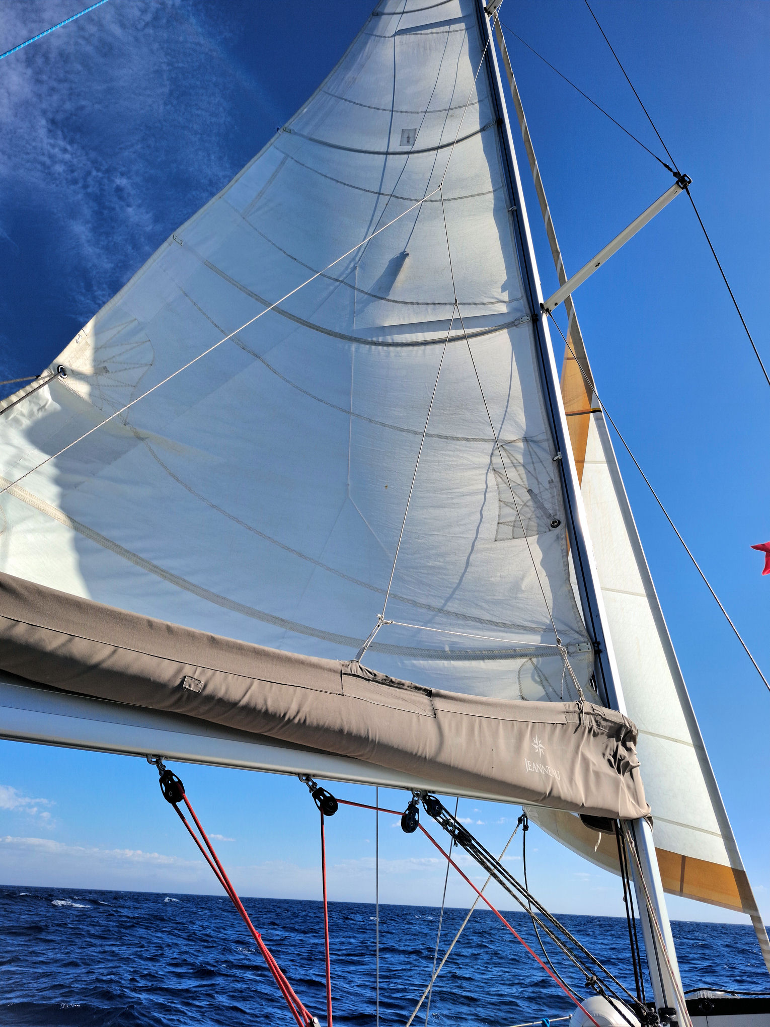Plavba na zadoboční vítr. Kolem dvanácté jsem stáhnul kosatku a převzal kormidlo, protože vlny z boku při plavbě s autopilotem loď nepříjemně nakláněly.