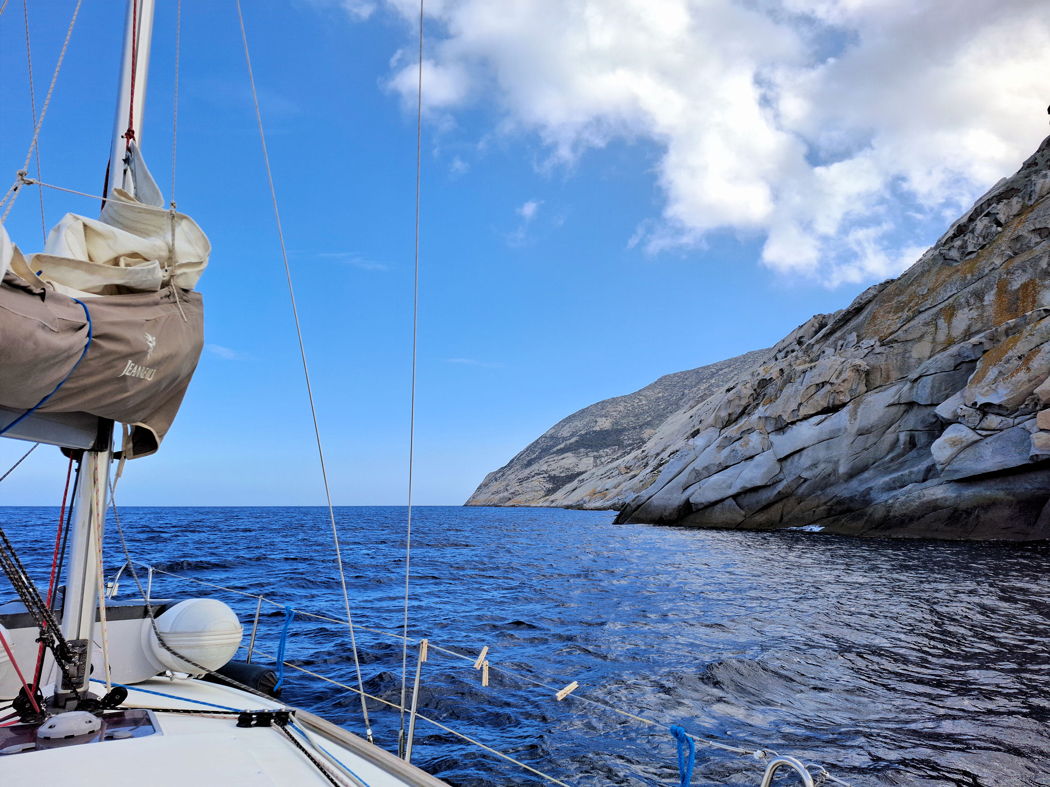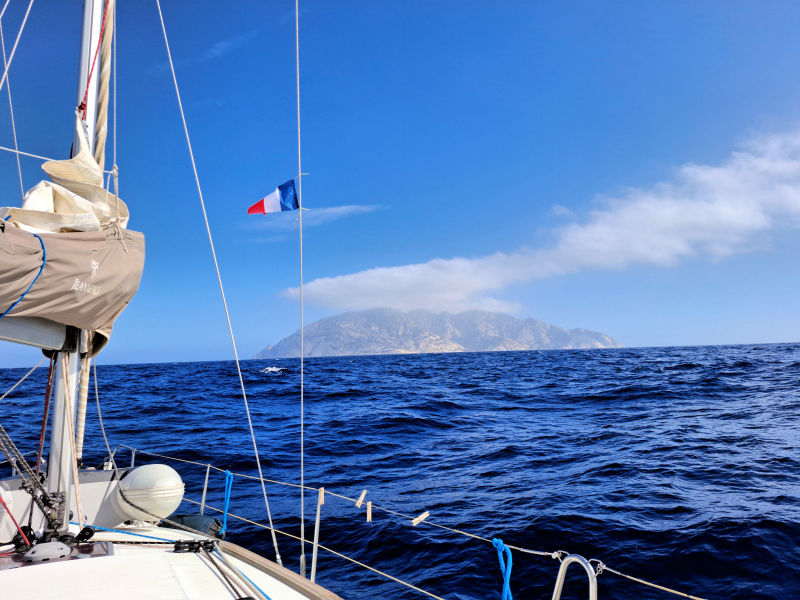 Kolem třetí jsem skasal i hlavní plachtu a poslední 2 Nm k ostrovu jsem plul už jen na motor.